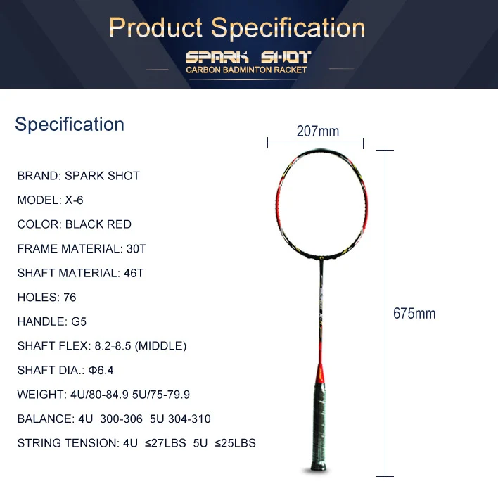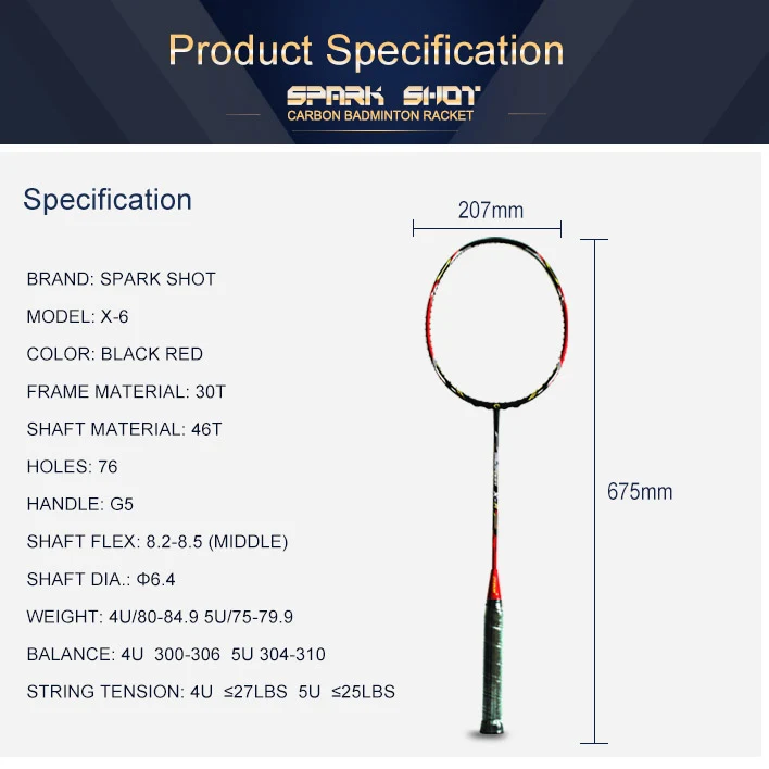 6,4 mm hřídele s vysokým modulem uhlíkového badmintonového rakety X6 je vyrobena pomocí uhlíkových materiálů s vysokým modulem. Materiál rámu 30T a šachta 46T a s průměrem super tenké hřídele 6,4 mm. Je to pro profesionálního hráče.